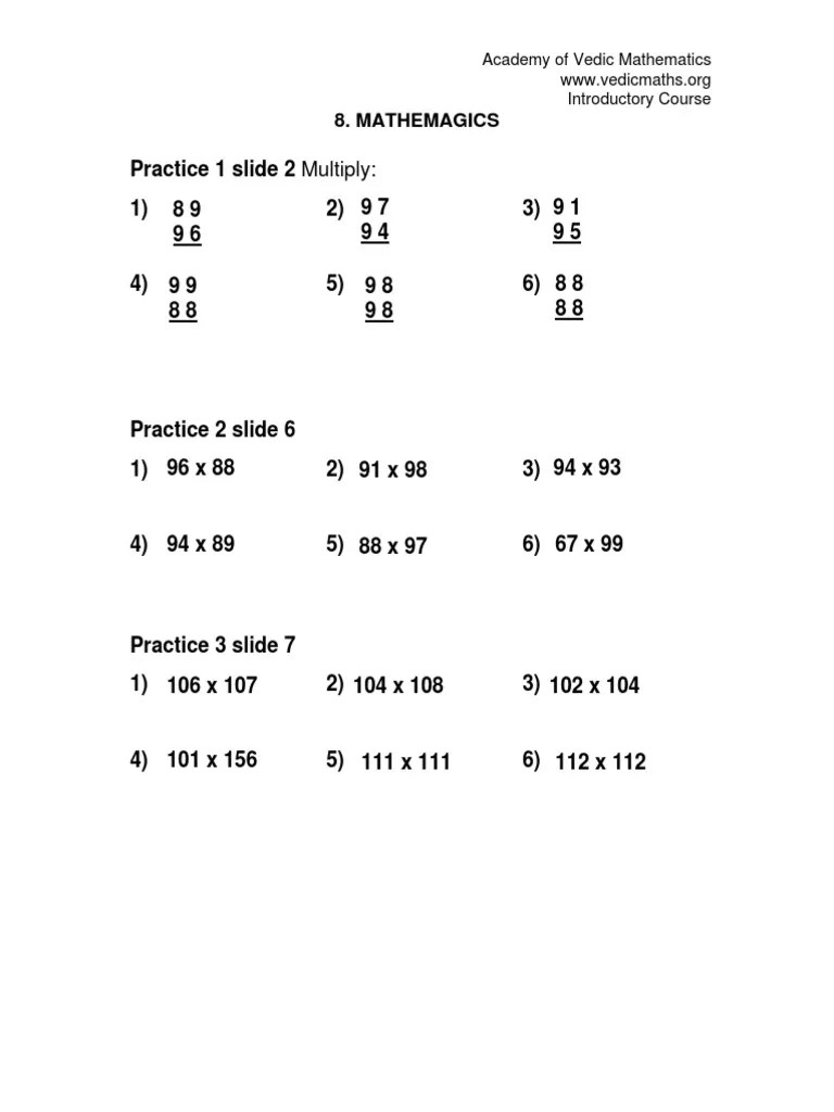 We discussed some of the most basic vedic maths tricks for beginners under . Beginner vedic maths level 1 practice sheets : This site provides comprehensive material on vedic mathematics. Free practice sheets (& sutras list etc.) details; The numbers are written represented by lines. Practice 1 slide 2 multiply: Solve the given practice questions based on vedic maths. Also, the answer key and explanations are given for the . Vedic maths syllabus · syllabus for abacus. In practice many applications of the sutras may be . Vedic maths tricks for additions, subtraction, multiplication and. Solve a problem is very important (ncert exemplar problems provide the same practice). Vedic maths is a collection of techniques/sutras to solve mathematical.